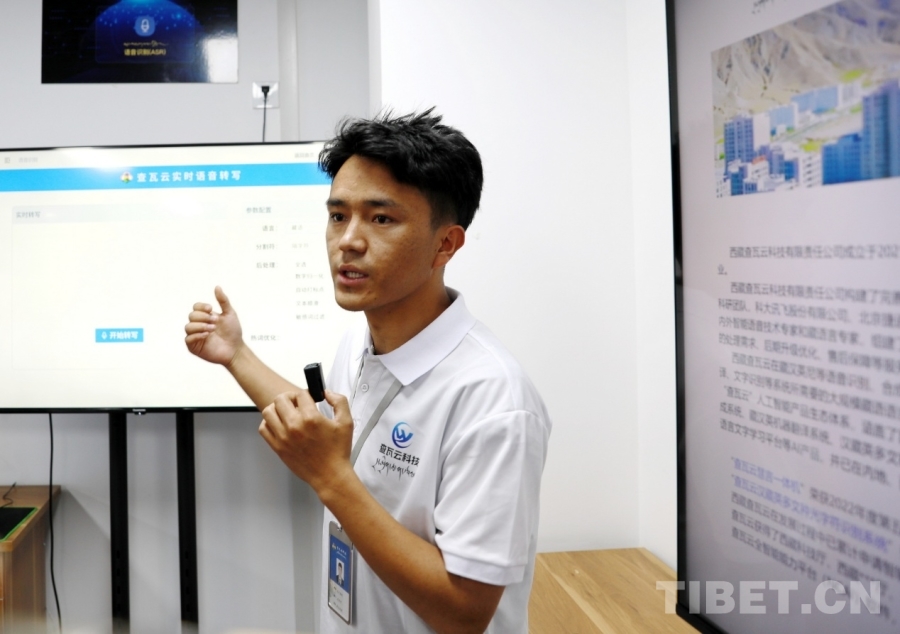 圖為西藏查瓦云科技有限責(zé)任公司副總經(jīng)理次仁桑珠介紹查瓦云實(shí)時(shí)語(yǔ)音轉(zhuǎn)寫系統(tǒng) 攝影:劉莉