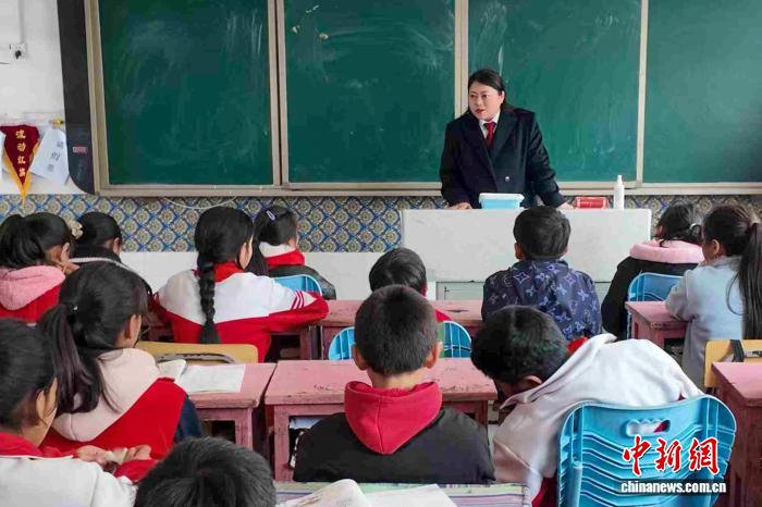 圖為2025年4月,全國(guó)政協(xié)委員、西藏墨脫縣人民法院綜合審判庭庭長(zhǎng)白瑪玉珍在墨脫縣格當(dāng)鄉(xiāng)小學(xué)為孩子們上法治課。(受訪者供圖)