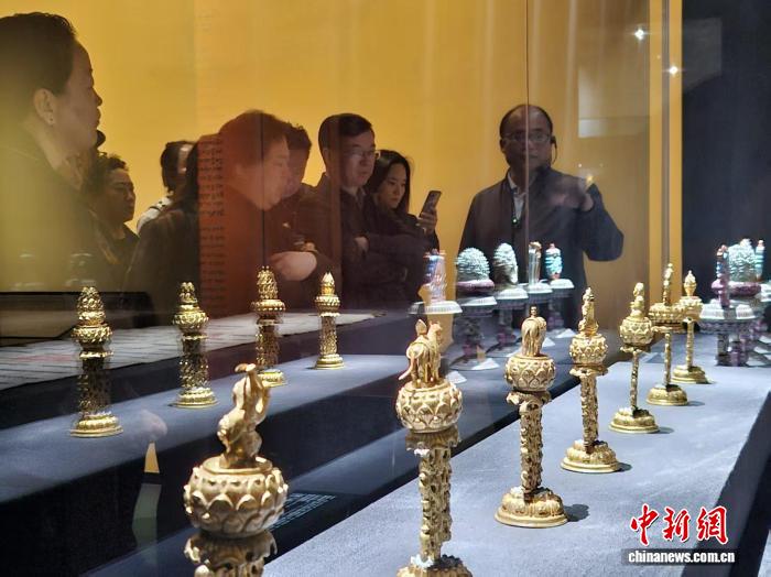 西藏自治區(qū)文物局黨組副書(shū)記、局長(zhǎng)曲珍介紹,本次展覽精選95件套(114件)珍貴文物,涵蓋瓷器、玉器、唐卡、造像等,集中展現(xiàn)了古代西藏與祖國(guó)內(nèi)地交往交流交融的歷史畫(huà)卷。其中,故宮博物院七世達(dá)賴(lài)進(jìn)獻(xiàn)乾隆皇帝的觀(guān)音菩薩像、六世班禪進(jìn)獻(xiàn)乾隆皇帝的佛窩、六世班禪額爾德尼九歲像等是首次回藏“探親”。另有來(lái)自西藏博物館的明代青花云龍紋執(zhí)壺,布達(dá)拉宮管理處的康熙御制銅胎畫(huà)琺瑯蓮花蓋碗,羅布林卡管理處的鍍金銅七珍寶等展出。
