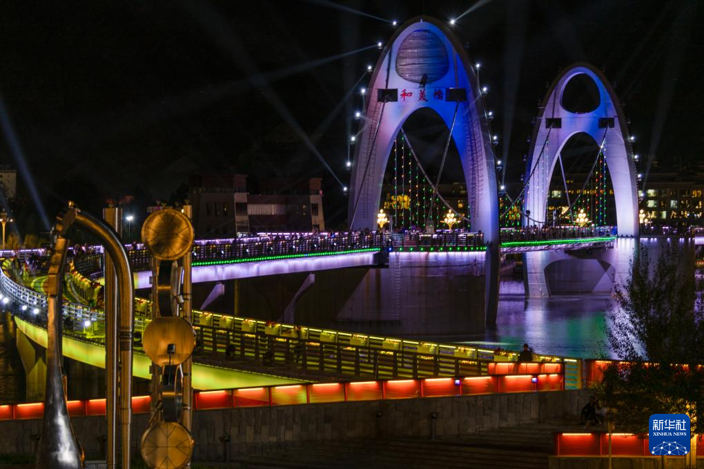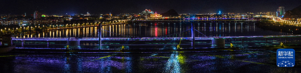 這是7月30日拍攝的拉薩河夜景,由近及遠(yuǎn)分別是和美橋、柳梧大橋和連心橋(無人機(jī)拼接照片)。新華社記者 姜帆 攝 ??
