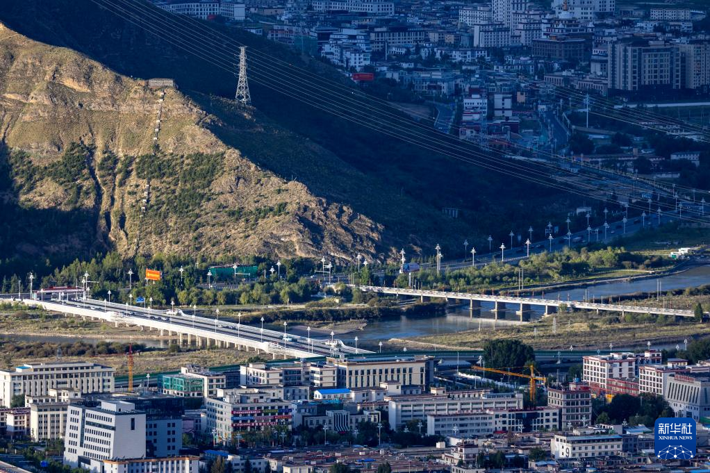 這是7月30日拍攝的拉薩河風(fēng)光,由近及遠(yuǎn)分別是連心橋、柳梧大橋、和美橋和青藏鐵路拉薩河特大橋。新華社記者 姜帆 攝