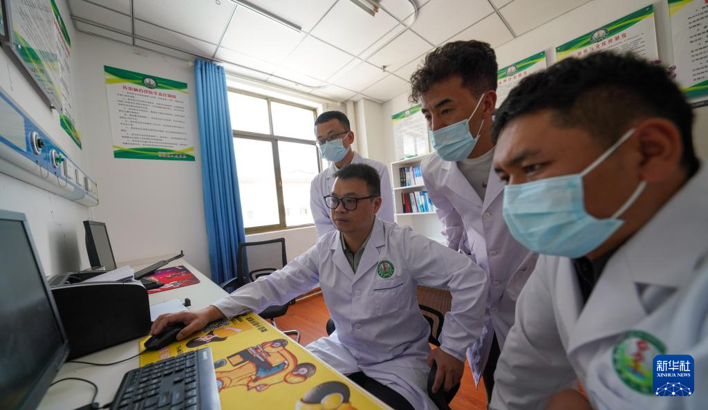 福建省泉州市惠安縣醫(yī)院援藏外科醫(yī)生張聰林(左二)和安溪縣醫(yī)院援藏外科醫(yī)生鄭毓能(左一)在和西藏昌都市洛隆縣醫(yī)院醫(yī)生巴桑扎西(右二)和格桑多布杰(右一)商討患者病情。新華社記者 晉美多吉 攝