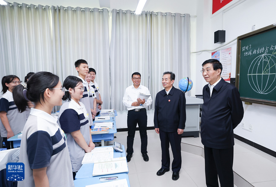 9月25日下午,受習近平總書記囑托,中共中央政治局常委、全國政協(xié)主席、中央代表團團長王滬寧帶領中央代表團部分成員在巴音郭楞蒙古自治州庫爾勒市看望慰問當?shù)馗髯甯刹咳罕?。這是王滬寧和中央代表團部分成員在庫爾勒市第二十三中學考察教育援疆情況。新華社記者 姚大偉 攝