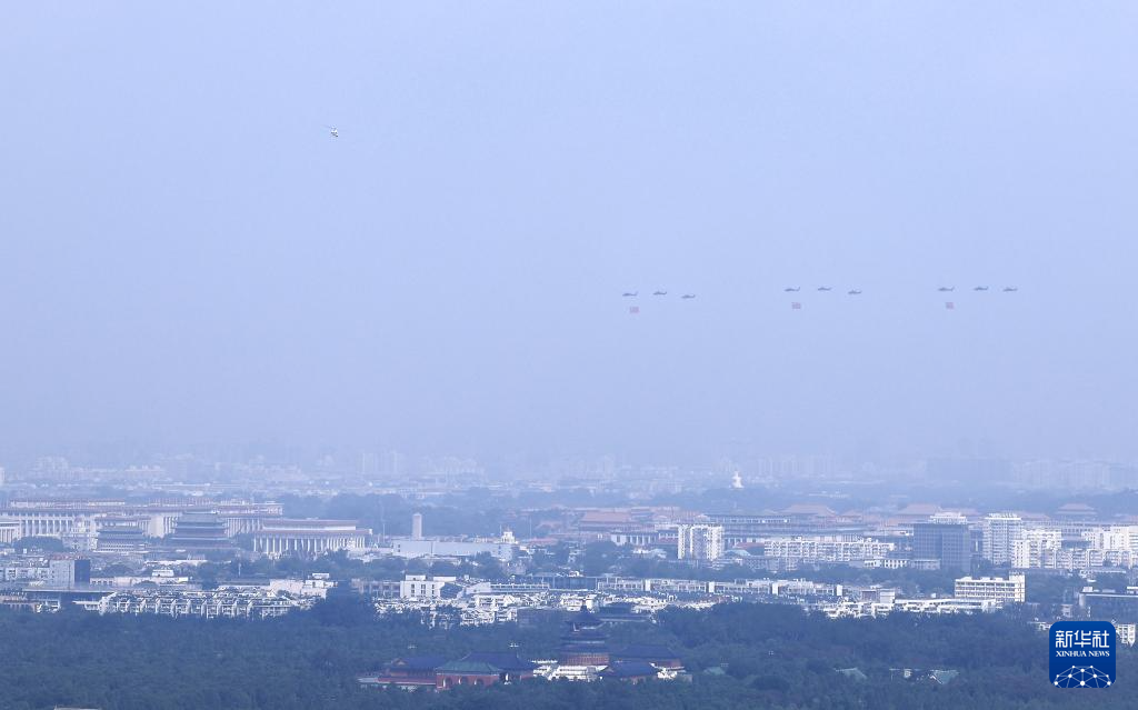 9月3日,紀念中國人民抗日戰(zhàn)爭暨世界反法西斯戰(zhàn)爭勝利80周年大會在北京隆重舉行。這是空中護旗梯隊通過天安門廣場。