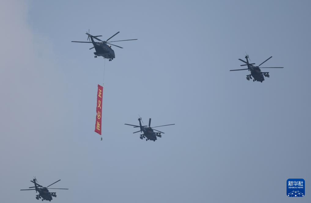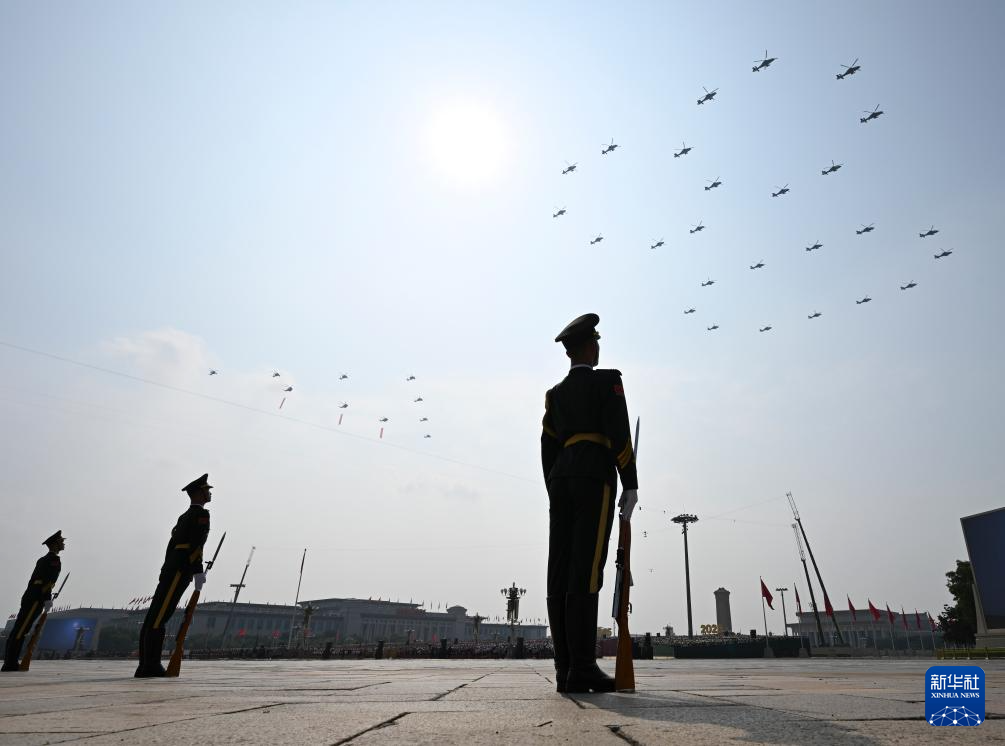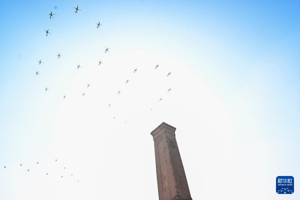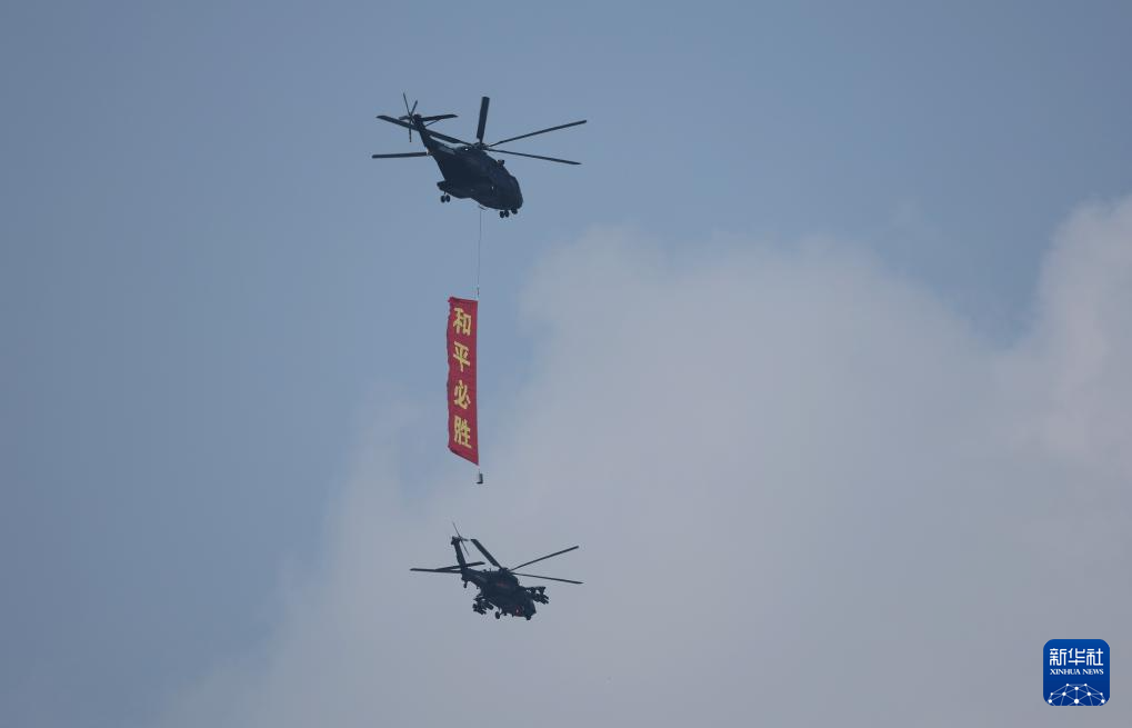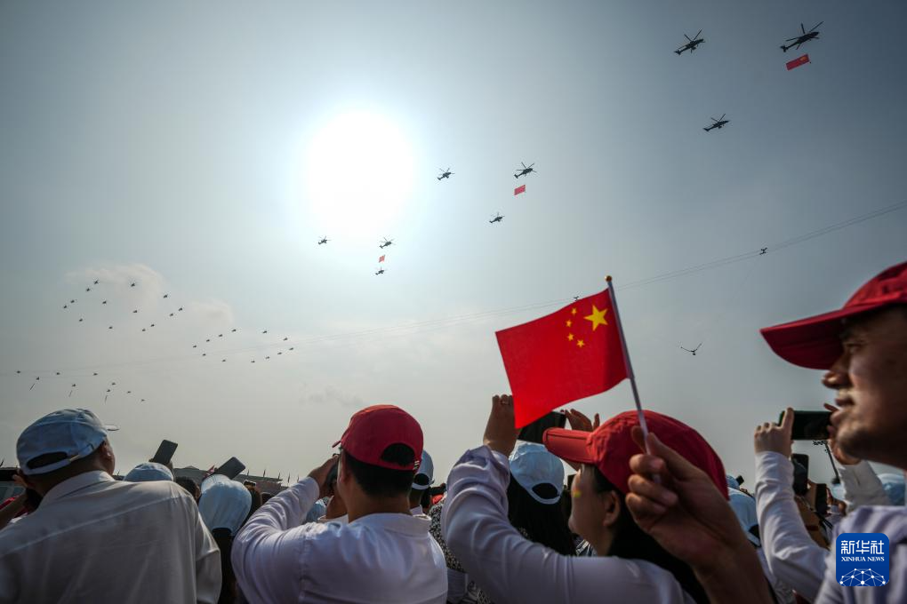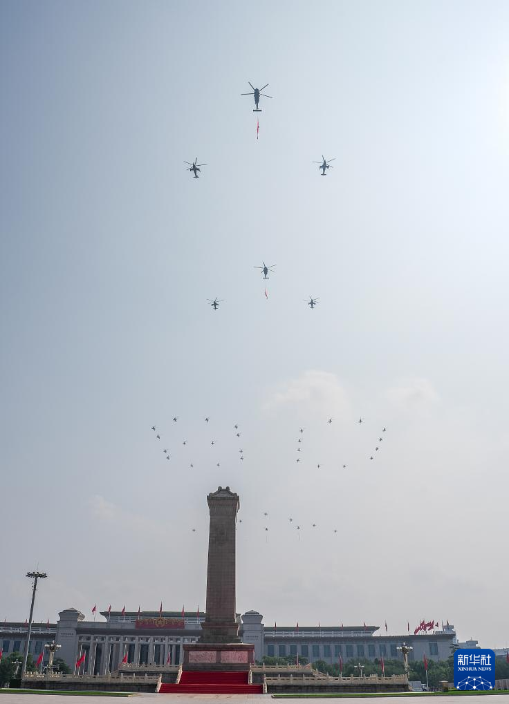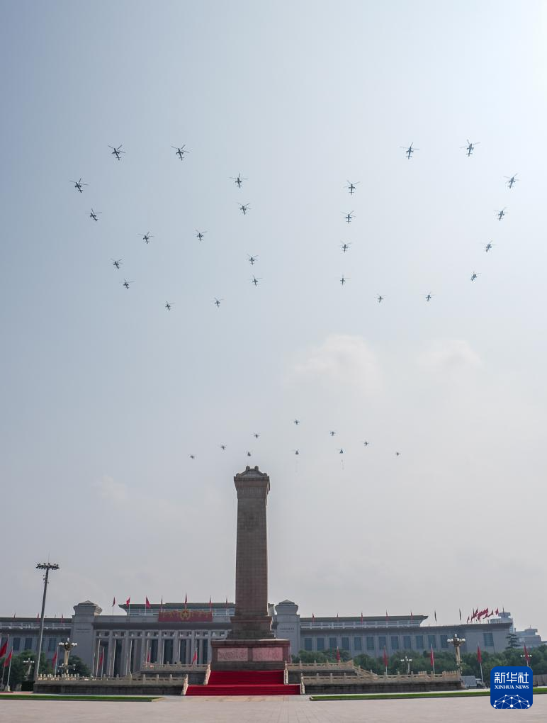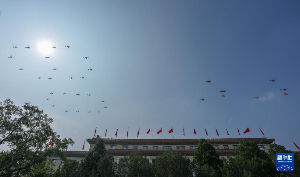 9月3日,紀念中國人民抗日戰(zhàn)爭暨世界反法西斯戰(zhàn)爭勝利80周年大會在北京隆重舉行。這是空中護旗梯隊飛過天安門廣場上空,26架直升機匯成巨大的“80”字樣。