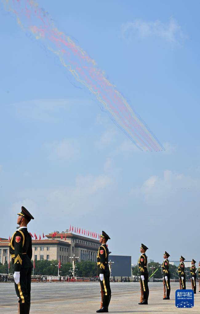 9月3日,紀念中國人民抗日戰(zhàn)爭暨世界反法西斯戰(zhàn)爭勝利80周年大會在北京隆重舉行。這是空中護旗梯隊飛過天安門廣場上空。