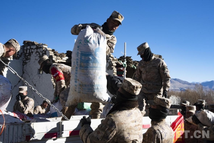 圖為在定日縣長所鄉(xiāng)嘎旦村解放軍官兵正在幫助受災(zāi)群眾搬運(yùn)社會(huì)各界所捐贈(zèng)的物資(攝于2025年1月8日) 攝影:趙振宇