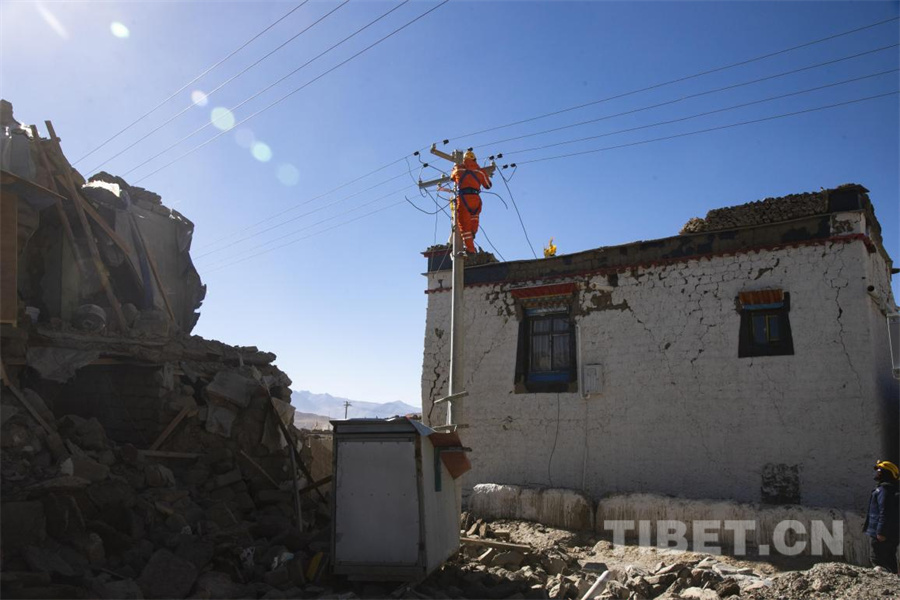 圖為地震發(fā)生第三日,在定日縣長所鄉(xiāng)森嘎村國家電網(wǎng)工作人員為受災(zāi)群眾安置點(diǎn)恢復(fù)電力供應(yīng)(攝于2025年1月9日) 攝影:趙振宇