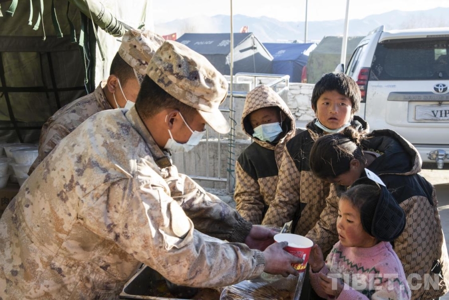 圖為在定日縣長所鄉(xiāng)古榮村安置點(diǎn)內(nèi),解放軍官兵為受災(zāi)群眾提供一日三餐(攝于2025年1月11日) 攝影:趙振宇
