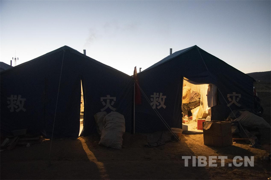 圖為地震發(fā)生第四日,夜幕即將降臨之時(shí)定日縣長所鄉(xiāng)雜村受災(zāi)群眾安置點(diǎn)內(nèi)救災(zāi)帳篷中泛起暖光(攝于2025年1月10日) 攝影:趙振宇