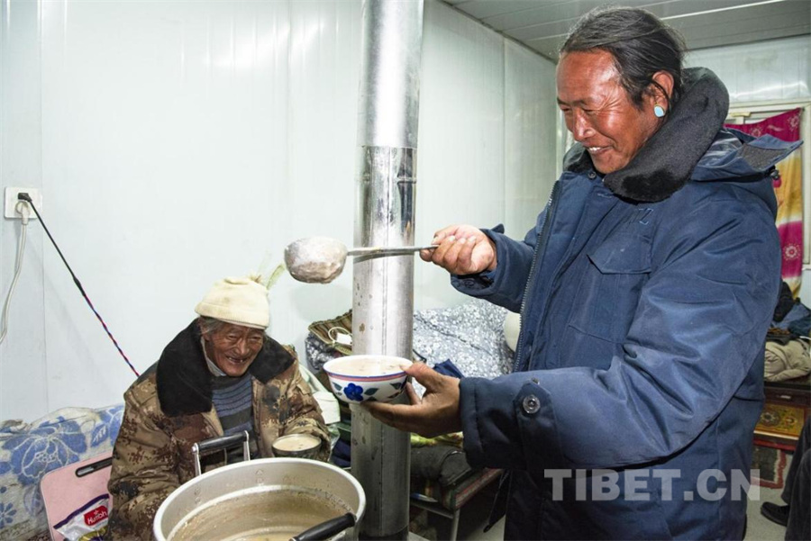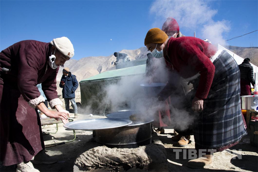 圖為震后第一個(gè)藏歷新年古突夜,在定日縣長所鄉(xiāng)茶江村受災(zāi)群眾安置點(diǎn)里,村民扎西正在盛出熱氣騰騰的“古突”(攝于2025年2月27日) 攝影:趙振宇