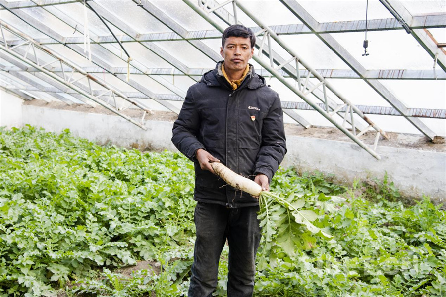圖為定日縣長所鄉(xiāng)嘎旦村村委會(huì)主任頓珠在震后修繕的蔬菜溫室大棚內(nèi)為記者展示棚內(nèi)種植出的白蘿卜(攝于2025年4月30日) 攝影:趙振宇
