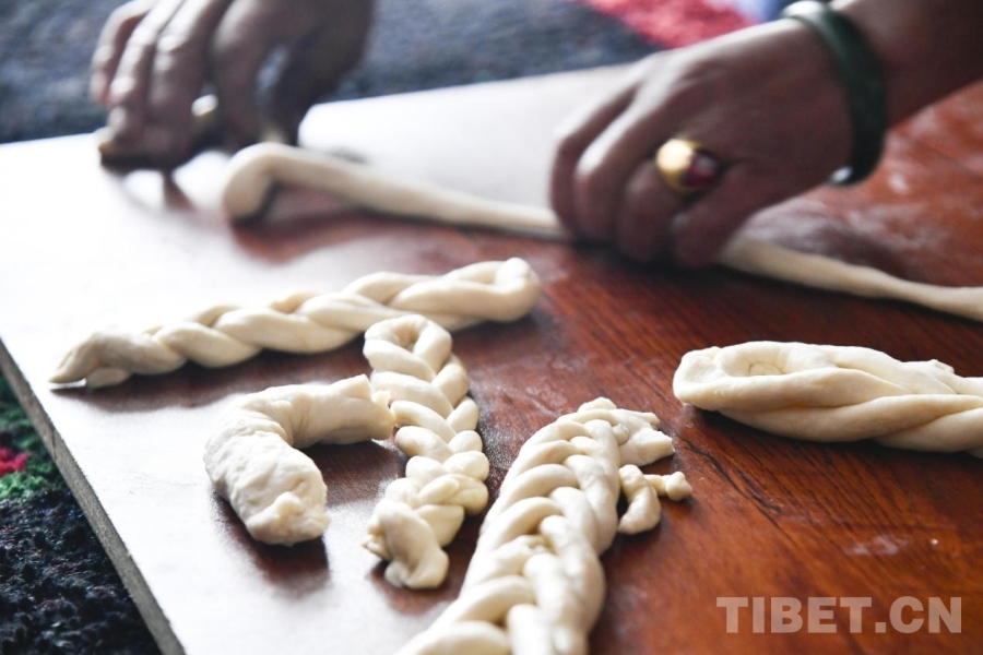 圖為薩迦縣雄麥鄉(xiāng)扎果村村民在新居內(nèi)制作傳統(tǒng)新年點(diǎn)心“卡塞”(攝于2026年1月6日) 攝影:趙振宇