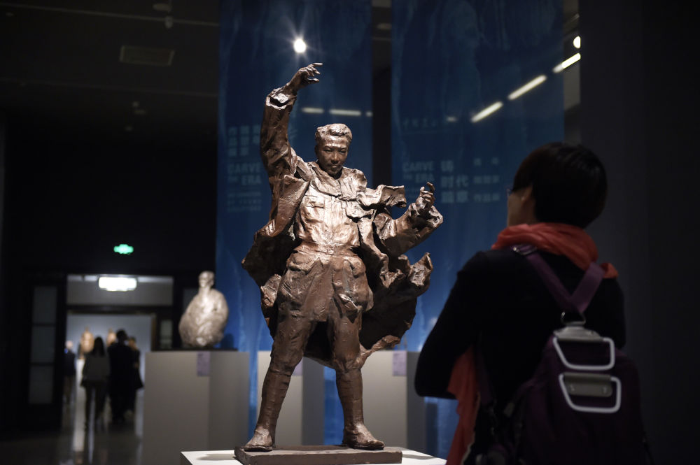2018年4月1日,參觀者在北京的中國(guó)美術(shù)館參觀雕塑作品“冼星?!?。