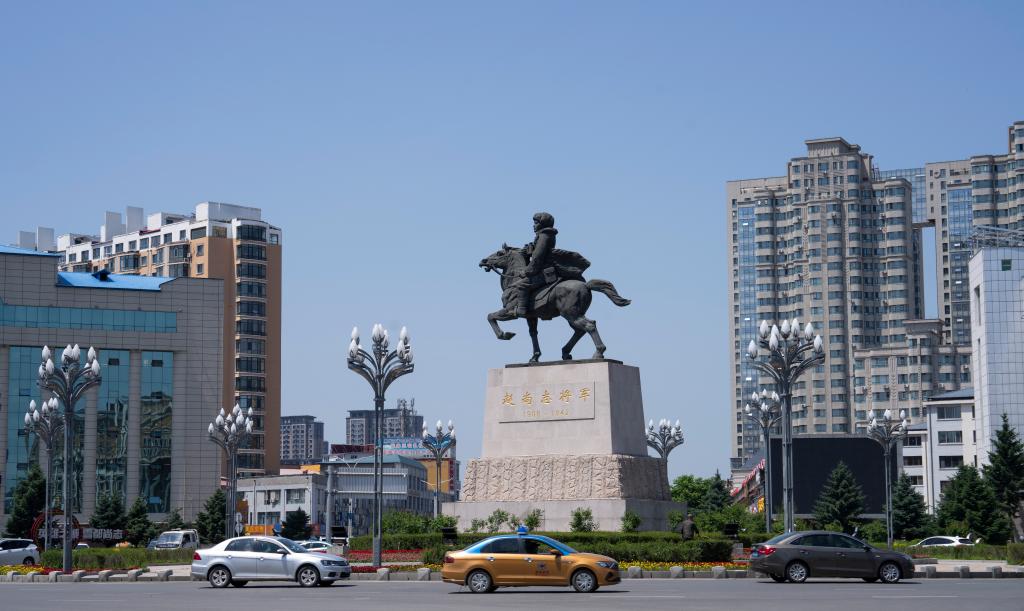 驅(qū)車駛?cè)牒邶埥∩兄臼?,一眼便看見環(huán)島中心屹然挺立的高大銅像:趙尚志將軍身騎戰(zhàn)馬,戎裝飛揚(yáng),他望向遠(yuǎn)方,好似凝視這一方和平安寧。