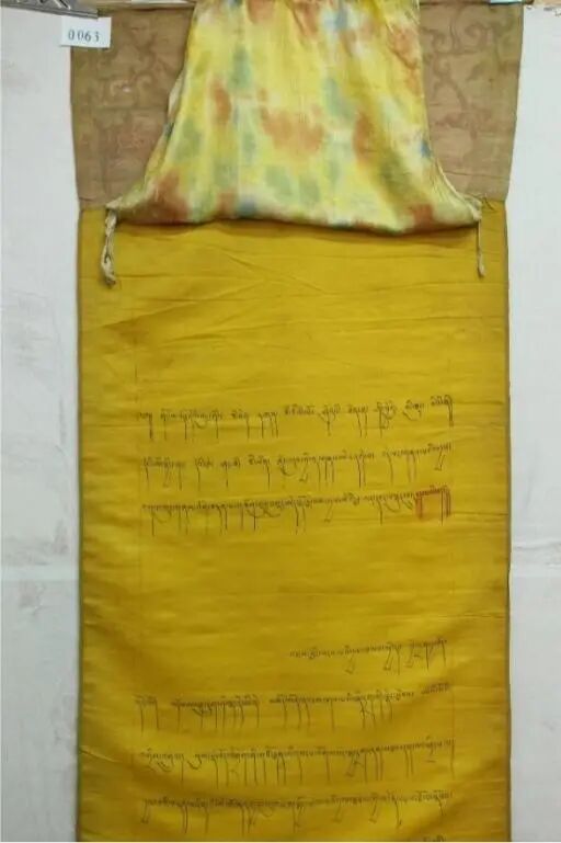 第四件文告發(fā)布于1698年(藏歷土虎年)(圖四),該文告是一件長達(dá)137厘米的黃色絲綢長卷,其起首格式同樣具有重大政治意涵:“奉皇帝圣旨,在霍爾領(lǐng)土之上第六世達(dá)賴?yán)锝饎偝诸C布的法旨”。這句話言簡意賅,卻構(gòu)成了一個完整的權(quán)力敘事閉環(huán):皇帝的旨意是最高權(quán)威來源,達(dá)賴?yán)锏慕塘钍窃诋?dāng)時清朝管轄下的和碩特蒙古勢力范圍(霍爾領(lǐng)土)內(nèi)行使。