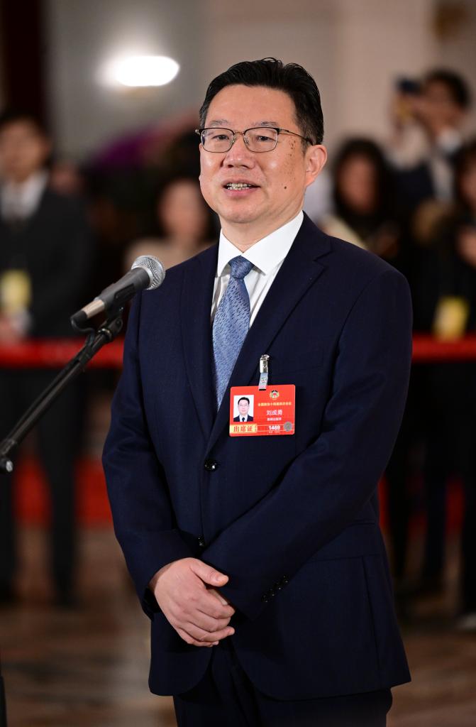 3月11日,全國政協(xié)十四屆四次會議第三場“委員通道”集體采訪活動在北京人民大會堂舉行。這是全國政協(xié)委員劉成勇接受媒體采訪。新華社記者 陳曄華 攝