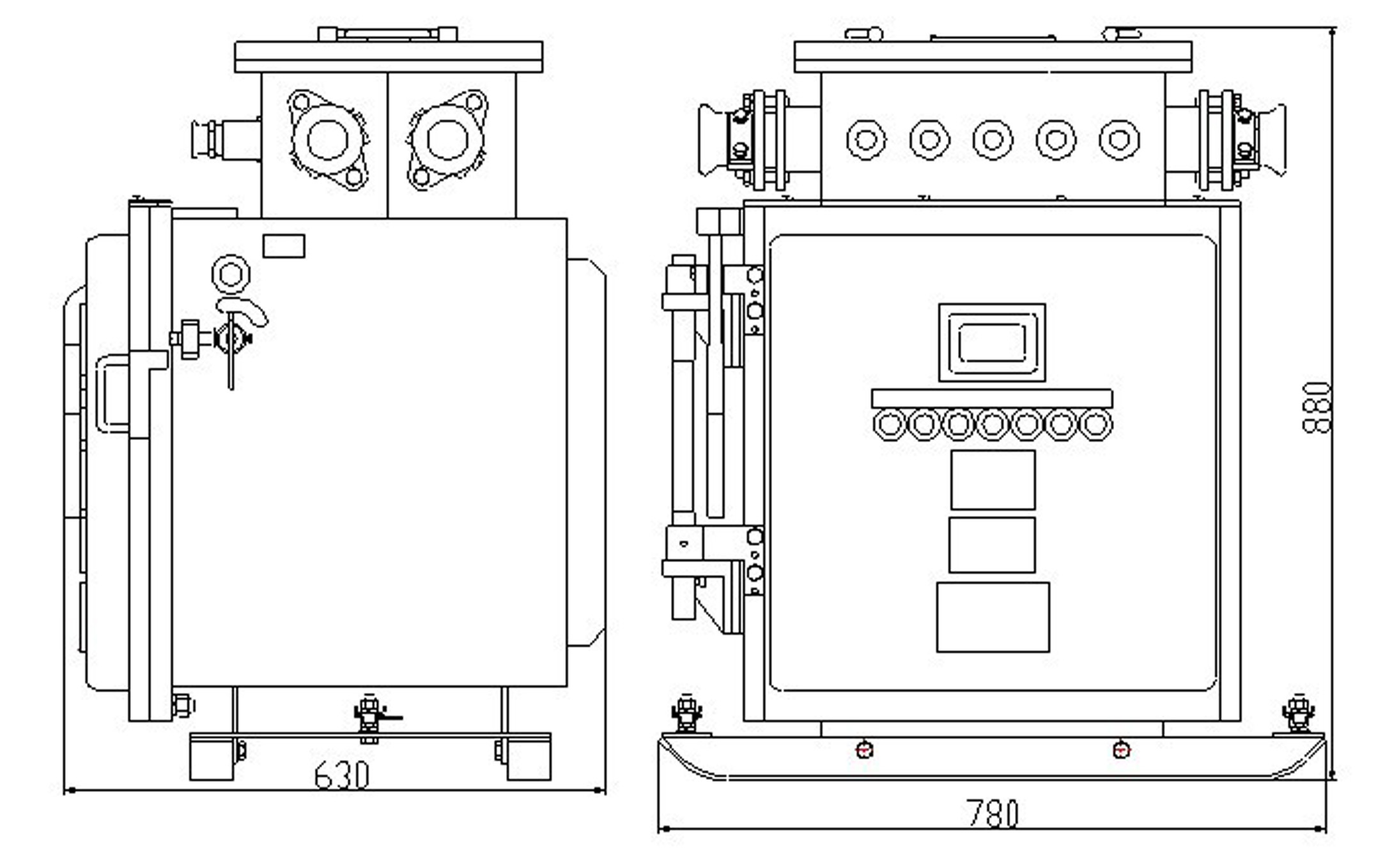 綜合裝置由隔爆外殼、主變壓器和控制部分等組成。隔爆外殼為方形,殼蓋與殼身采用滑動止口結構,開啟方便。外殼上部的接線箱作為引進和引出電纜用,外殼右側裝有操作組合開關的手柄,并有可靠的機械聯(lián)鎖裝置,門蓋上裝有控制按鈕和試驗按鈕,門蓋上有一觀察窗,可以從外面觀察到裝置里面液晶漢顯顯示屏的指示狀態(tài)。殼體內(nèi)的控制部分由控制器件板和真空交流接觸器板組成。在控制器件板上裝有微電腦控制器、液晶顯示屏、電流取樣板、電流傳感器、濾波器、電源控制變壓器、試驗電阻、保險等器件。真空交流接觸器板上裝有真空交流接觸器、管式熔斷器,電流互感器,三相電抗器等器件。控制器件板與真空交流接觸器板通過一組航空插件及連線構成聯(lián)系。防爆外殼箱體內(nèi)裝有主變壓器。